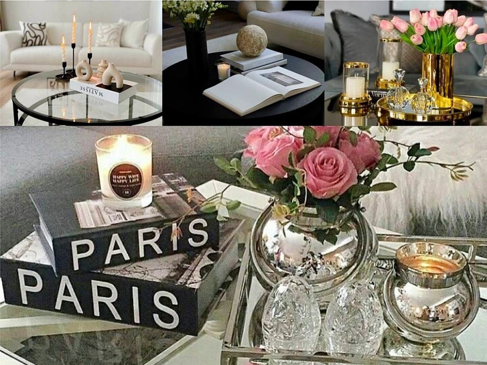 از گلدان‌های دکوری شیشه‌ای با چند شاخه گل مصنوعی استفاده کنید. یک سینی گرد یا مربعی روی میز قرار دهید و درونش وسایل دکوری مثل شمع، گل، یا کتاب‌ها بچینید.