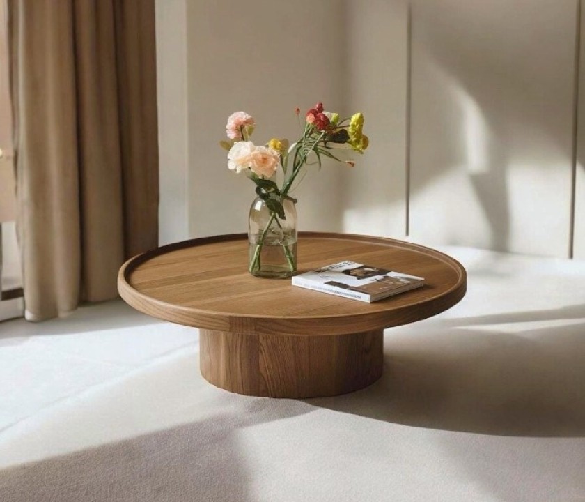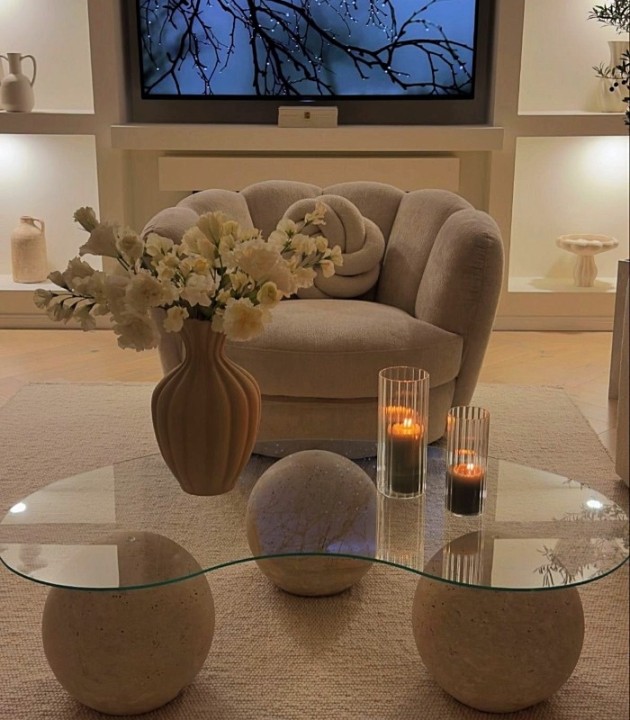 میز جلو مبلی گرد با شکل نرم و خوش‌تراز خود، فرصت عالی برای چیدمان‌های هنری و متعادل به شما می‌دهد. در چیدمان میز گرد بهتر است وسایل را به شکل مثلثی بچینید(یک عنصر بلند، یکی متوسط و یکی کوتاه) این چیدمان چشم را به گردش در می‌آورد و از حالت تخت و خسته‌کننده جلوگیری می‌کند. می توانید از عناصر با شکل‌های متفاوت (دایره، مربع، نامتقارن) استفاده کنید اما رنگ‌ها را هماهنگ نگه دارید تا شلوغ دیده نشود.