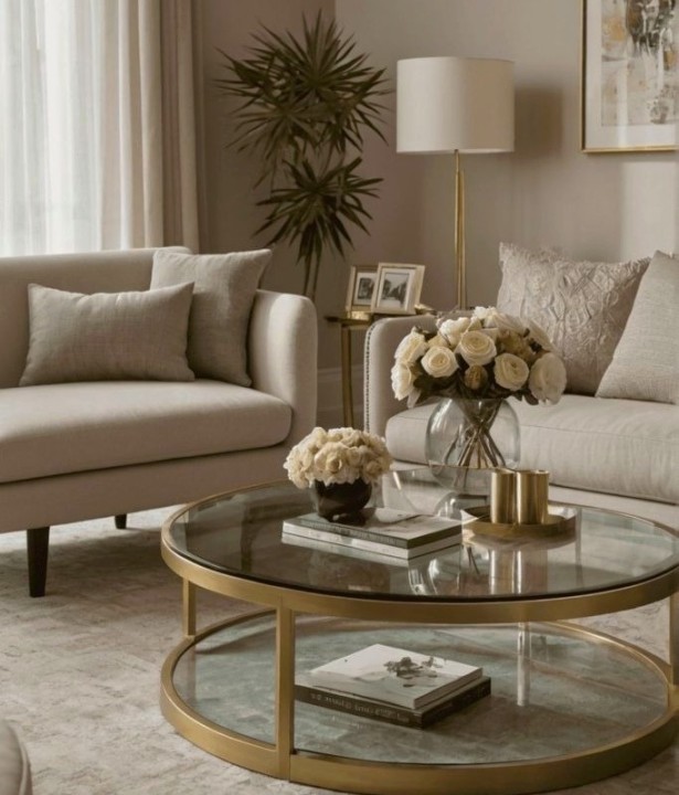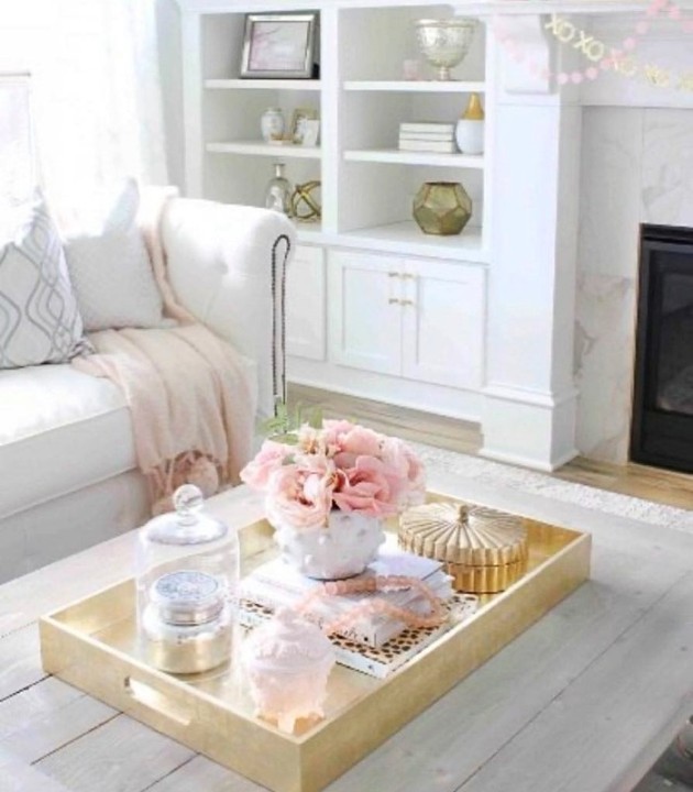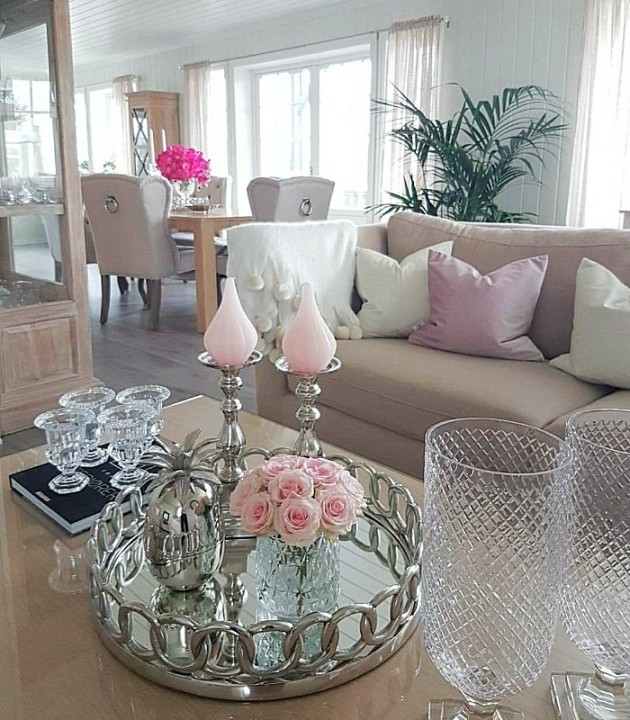 از گلدان‌های دکوری شیشه‌ای با چند شاخه گل مصنوعی استفاده کنید. یک سینی گرد یا مربعی روی میز قرار دهید و درونش وسایل دکوری مثل شمع، گل، یا کتاب‌ها بچینید.